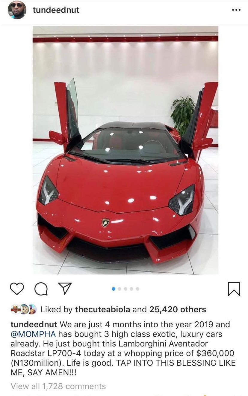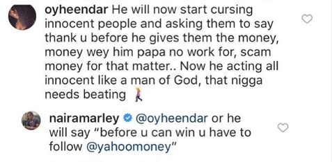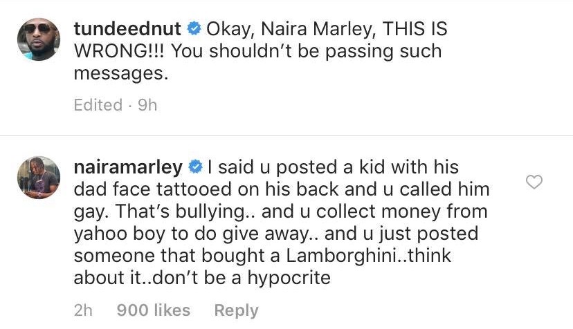 “I said u posted a kid with his dad face tattooed on his back and u called him gay. That’s bullying.. and u collect money from yahoo boy to do give away.. and u just posted someone that bought a Lamborghini..think about it..don’t be a hypocrite”