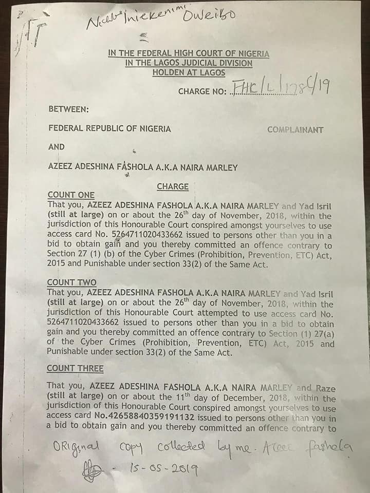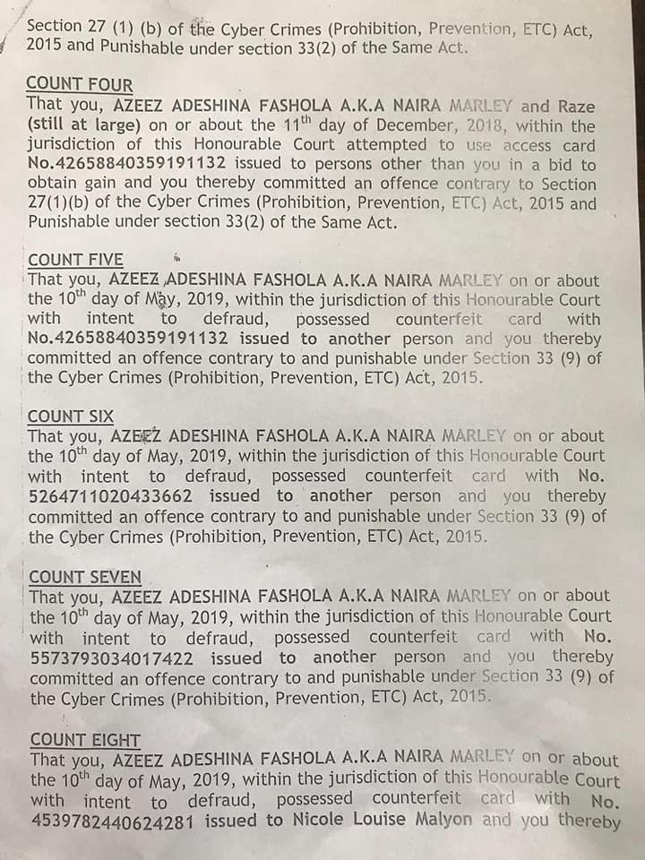 Count One of the charges reads: “That you, Azeez Adeshina Fashola, aka Naira Marley and Yad Isril (still at large) on or about the 26th day of November 2018, within the jurisdiction of this Honourable Court conspired among yourselves to use access card No. 5264711020433662 issued to persons other than you in a bid to obtain gain and you thereby committed an offence contrary to Section 27 (1) (b) of the Cyber Crimes (Prohibition, Prevention, ETC) Act, 2015 and punishable under section 32 of the same act.