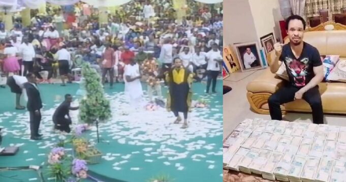 Popular Anambra-based clergyman, Odumeje, held his end-of-the-year thanksgiving service on Sunday, December 12 and people who attended the powerful event witnessed an overwhelming flow of cash.