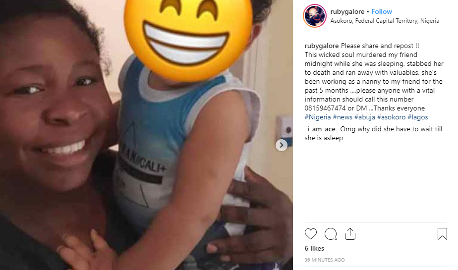 A Nigerian Lady, identified as Ruby Galore on the gram, has taken to her page to narrate how a nanny, Johnson Becky, stabbed her friend, Yemisi, to death in the Asokoro area of Abuja, the country’s capital.
