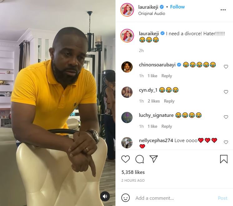 Reacting to her husband’s comment while sharing the video on her official Instagram page, Laura wrote, “I need a divorce! Hater!!!!!!! 😂😂😂”.