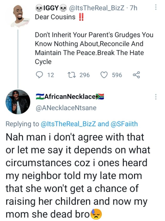 The Twitter user, with handle, @ANecklaceNtsane revealed the story in reaction to a post of another Twitter user who advised people to stop hating others because they had problem with their parents.