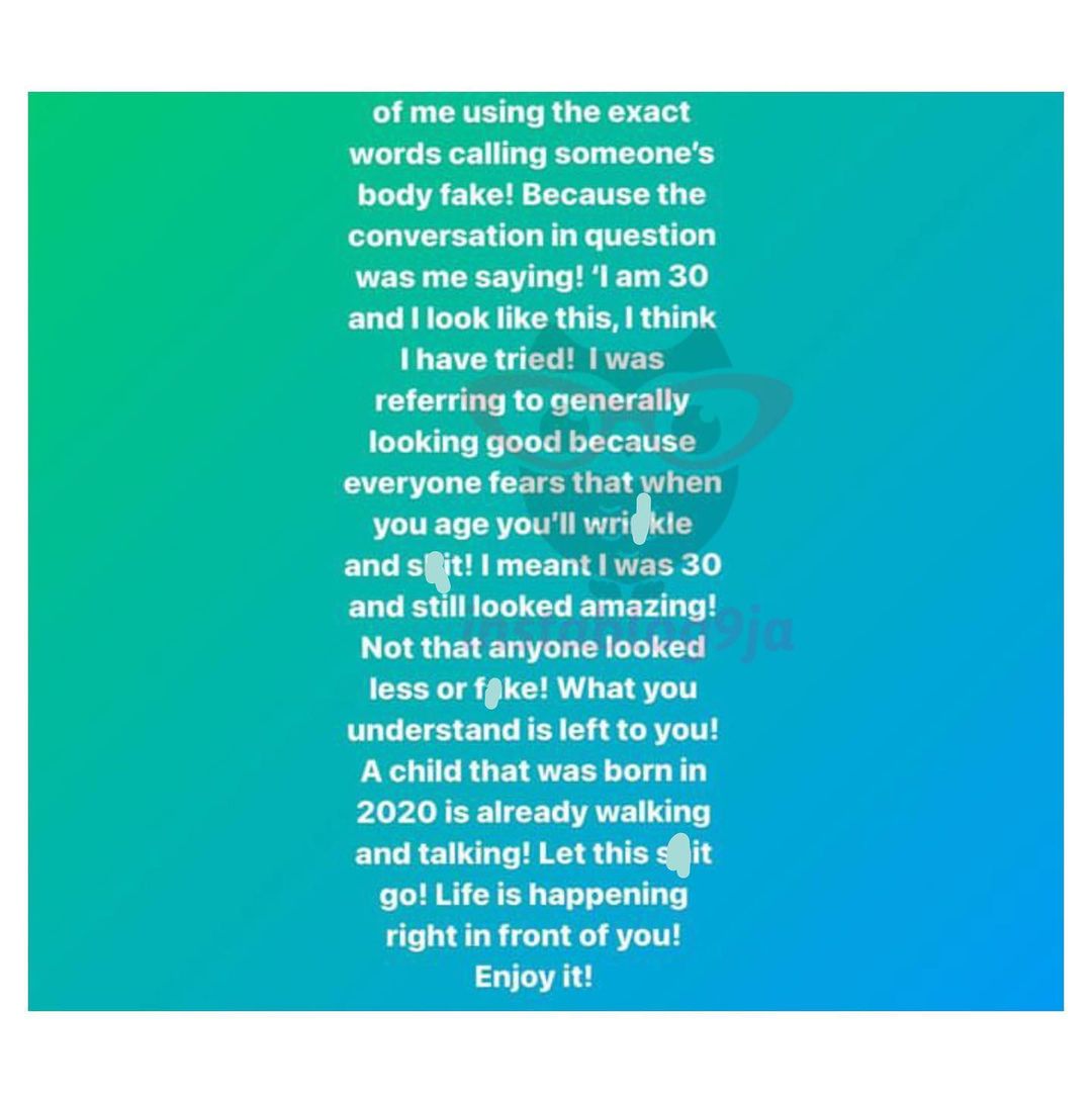 “I heard lipo for the first time when Ka3na talked about it. I still don’t understand the process till this year when my friend got it done. I can’t convince you on what to believe. I can only tell my truth. There’s no way I could have said Nengi’s body was fake. I never even saw what a surgery body looked like then.” She said.
