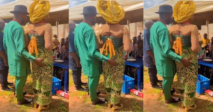 However, the groom grew mischievous as he roughly squeezed his wife’s buttock in front of all gathered. His intention whether to peel it off her back or gauge its heaviness is not ascertained.