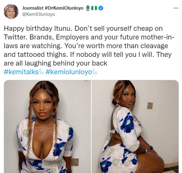 Sharing photos of the influencer, Kemi wrote, “Happy birthday Itunu. Don’t sell yourself cheap on Twitter. Brands, Employers and your future mother-in-laws are watching. You’re worth more than cleavage and tattooed thighs. If nobody will tell you I will. They are all laughing behind your back.”