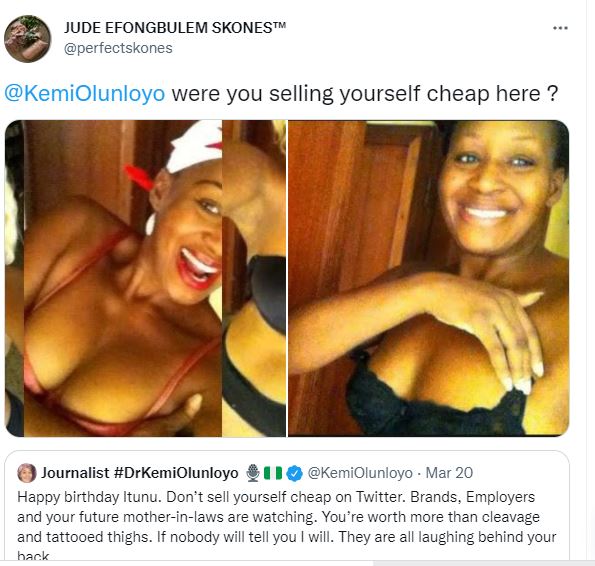 Reacting to her post, a Twitter user went ahead to dig up old semi-nude photos of the controversial journalist and asked if she was also selling herself cheap when she posted those photos online.