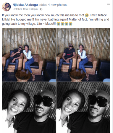 “I met Tuface Idibia, He hugged me”, Njideka exclaimed on Facebook, she continued; “I’m never bathing again! Matter of fact, I’m retiring and going back to my village. Life = Made… *Crying smiley*