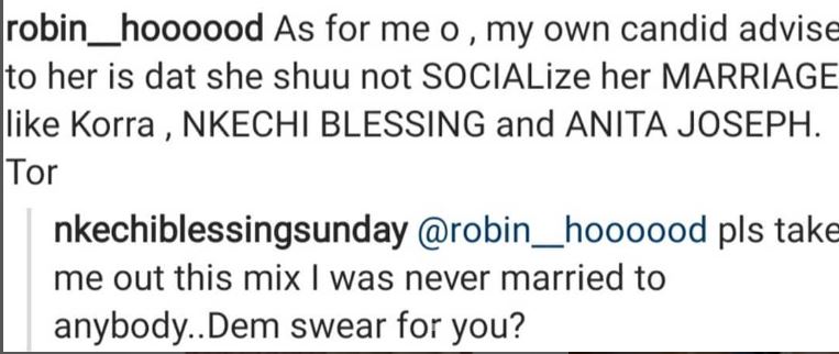 Nkechi then responded to the user, slamming them for saying that she was ever married. Her response comes after news got rife that her and her ex, Opeyemi David Falegan split.