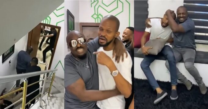 Not long after Nollywood actor, Jim Iyke, admitted that his viral fight with controversial colleague, Uche Maduagwu, some months back was a publicity stunt, a never before seen video showing the moment both actors burst into laughter after their “fight” has come to light.