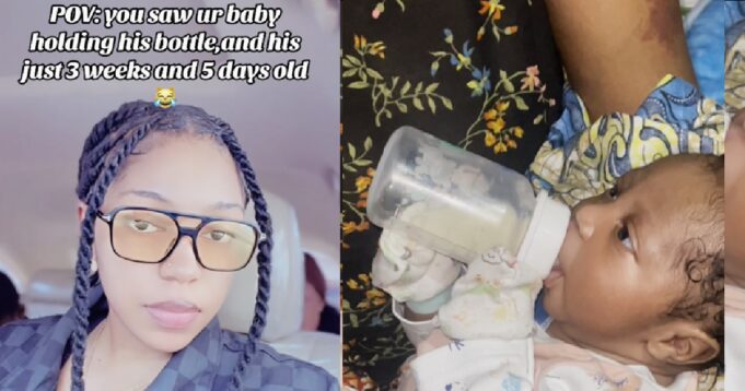 A new mother, @tutu970 expresses shock over her infant child holding his own feeding bottle during a meal.