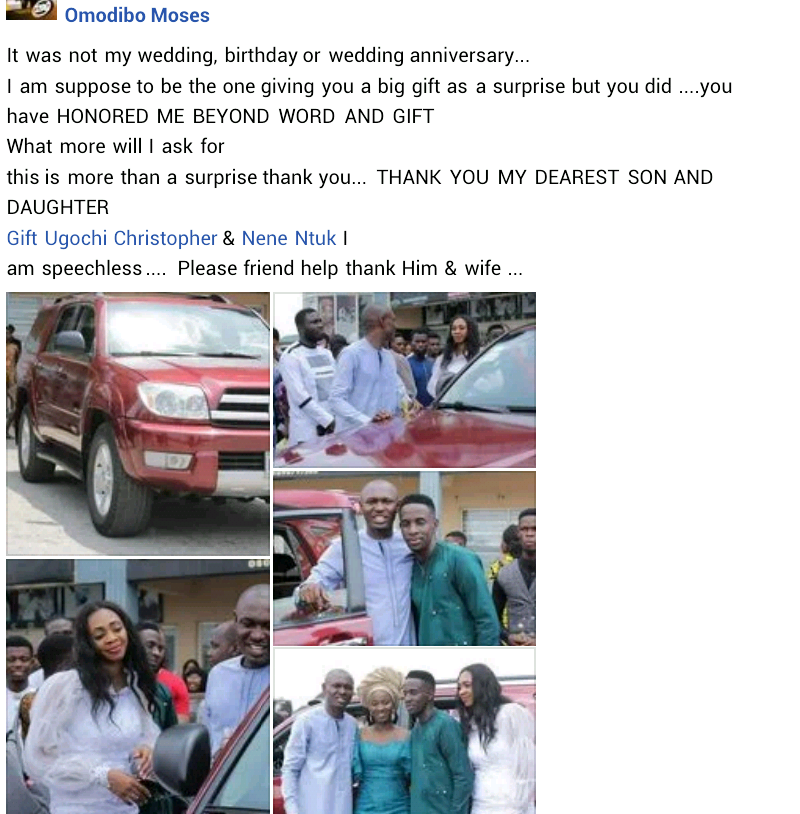 “It was not my wedding, birthday or wedding anniversary… I am suppose to be the one giving you a big gift as a surprise but you did ….you have HONORED ME BEYOND WORD AND GIFT. What more will I ask for. this is more than a surprise thank you… THANK YOU MY. dearest son and daught, Gift Ugochi Christopher and Nene Ntuk. I am speechless …. Please friend help thank Him & wife”.
