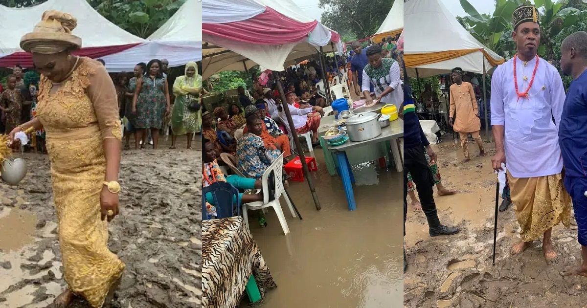 A Nigerian couple’s wedding celebration has attracted many people’s attention after they gladly accepted an unexpected, heavy downpour that converted their outdoor reception into a muddy celebration of their nuptials.