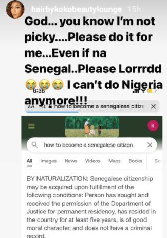 Sharing a screenshot of her google search of how to become a Senegalese citizen, the entrepreneur told God that she is not demanding for too much and she is fine with being a citizen of Senegal, rather than being a Nigerian.
