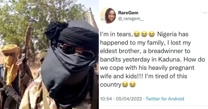 A Nigerian lady has taken to social media to mourn the death of her brother who she said was killed by Bandits in Kaduna state on Monday, April 4.