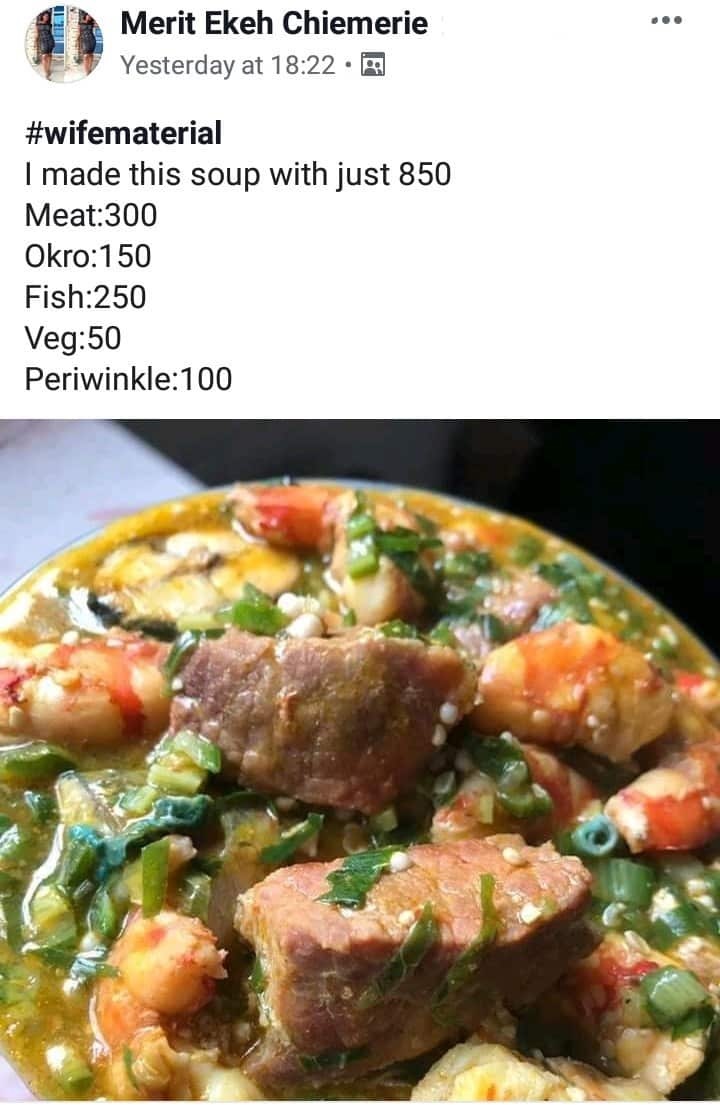 A Nigerian Lady has conferred on herself the title of “wife material” after alleging she cooked a thick pot of soup with only 850 Naira.