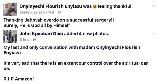 A Man on Facebook, John Boobarri Diidi says 5 months ago, he had a terrible dream about one of his Facebook friend.. narrating the dream, he said the Lady he dreamt about died after a failed operation.