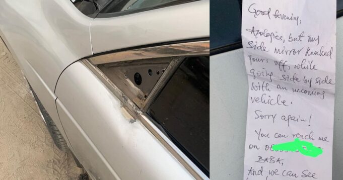 A Nigerian man recently had his Car side-mirror knocked-off but he was shocked to discover that the offender (who could have opted to remain unknown) dropped a note with his contact information while also apologizing for the damage caused.
