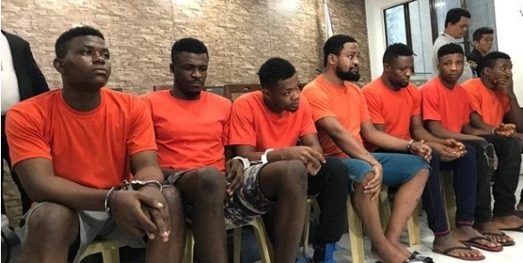 The suspects are identified as Kenneth Chuku, Ikenna Dickson Okalla, Chukwuma George Adible, Chiboy Stanley Agbasy, Dim Remedios, Abas Kashmir, and Uba Living.