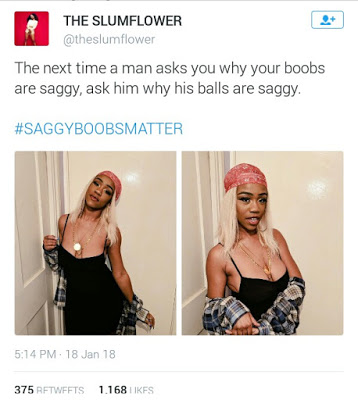 A London-based Nigerian blogger, Chidera Eggerue, popularly known as ‘The Slumflower’ has taken to social media to show off her Saggy chest.