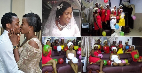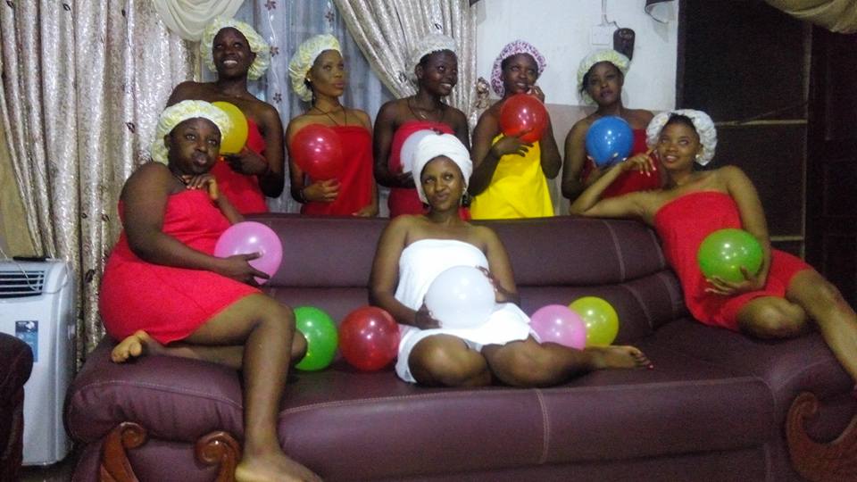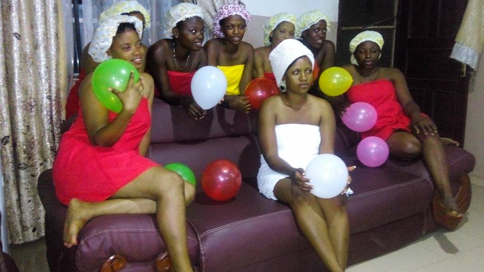 The girls only clad with wine coloured towels and shower caps posed by the bride who donned a white towel, distinguishing herself from the rest.