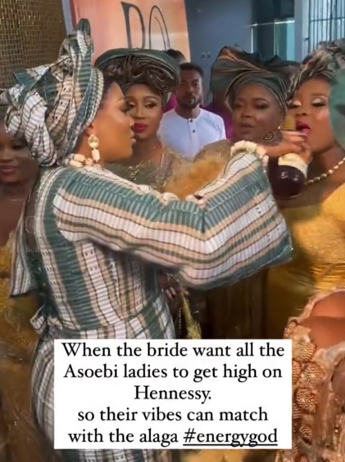 “When the bride wants all the Asoebi ladies to get high on Henessy so their vibes can match with the alaga #energygod”, says the caption.