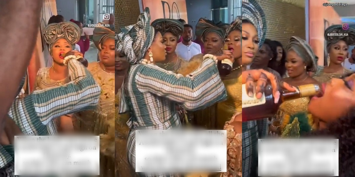 A video shared on TikTok shows the bride pouring the content of an Henessy bottle into the mouths of her asoebi girls at her traditional wedding held recently.