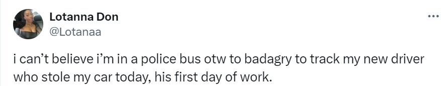 A Nigerian businesswoman who identified as @Lotanaa has shared on X (Twitter) how her new driver stole her car.