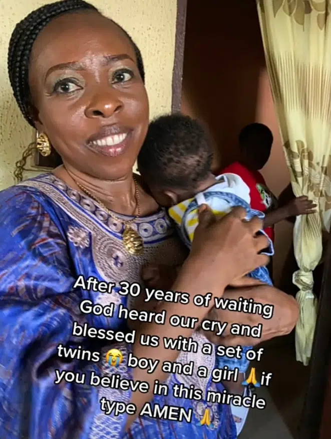 The video was shared on TikTok with the caption, “After 30 years of waiting, God heard our cry and blessed us with a set of twins. A boy and a girl.”