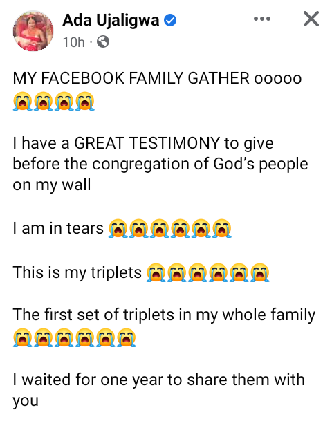 “I have a GREAT TESTIMONY to give before the congregation of God’s people on my wall. I am in tears. This is my triplet. The first set of triplets in my whole family. I waited for one year to share them with you,” she wrote.