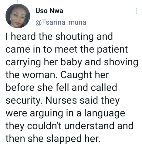 I heard the shouting and came in to meet the patient carrying her baby and shoving the woman. Caught her before she fell and called the security. Nurses said they were arguing in a language they couldn’t understand and then she slapped her