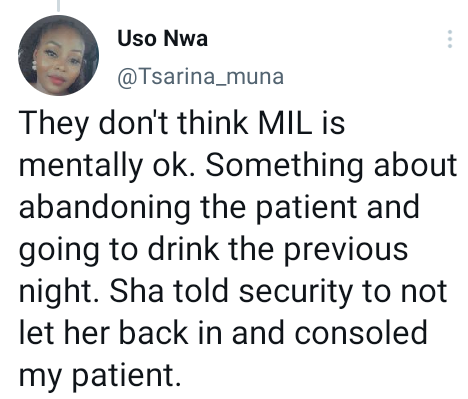 They don’t think MIL is mentally ok. Something about abandoning the patient and going to drink the previous night. Sha told security to not let her back in and consoled my patient.”