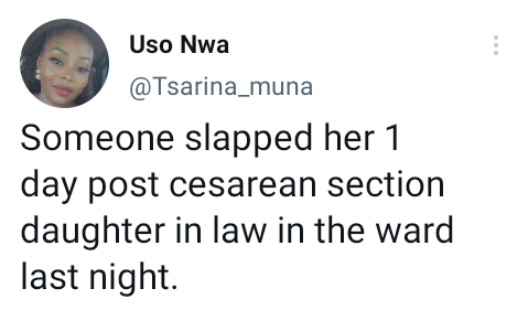 “Someone slapped her 1 day post-cesarean section daughter-in-law in the ward last night. Nothing we don’t see here 😭