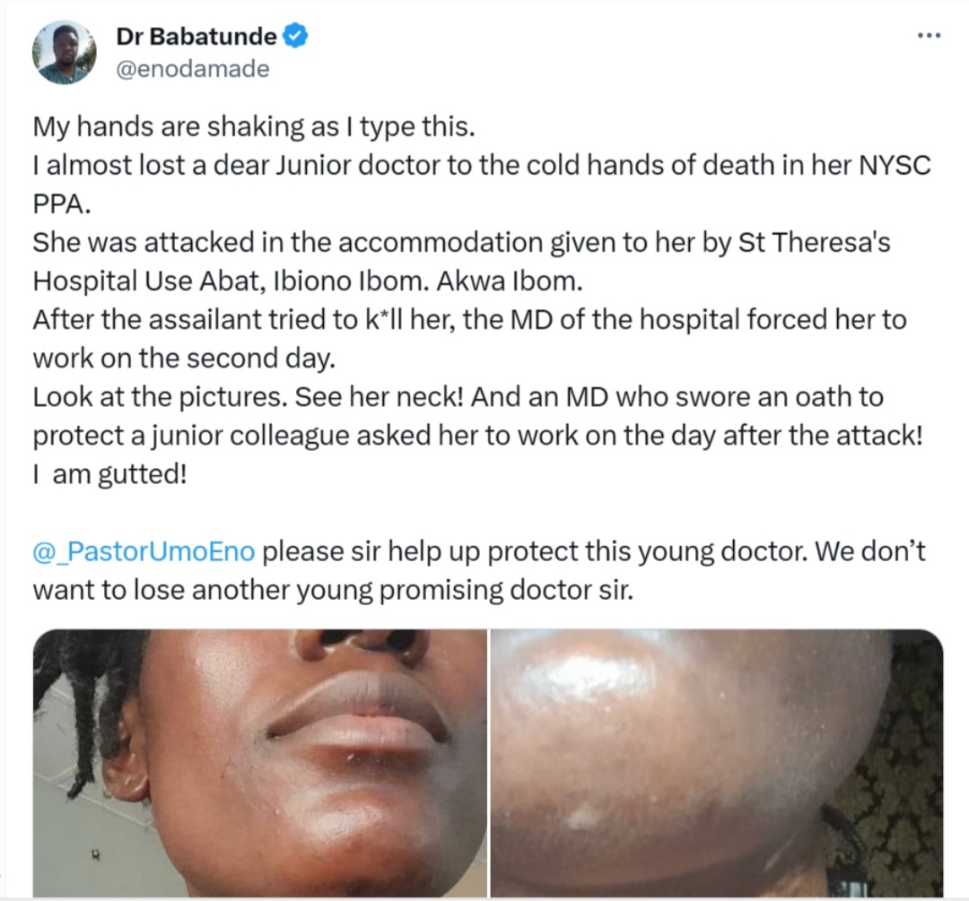 A Nigerian doctor has made a plea for help online, asking for assistance following an incident where a junior doctor dear to him, narrowly escaped a life-threatening attack and was compelled to resume work by the Managing Director of the hospital where she is serving her NYSC assignment.