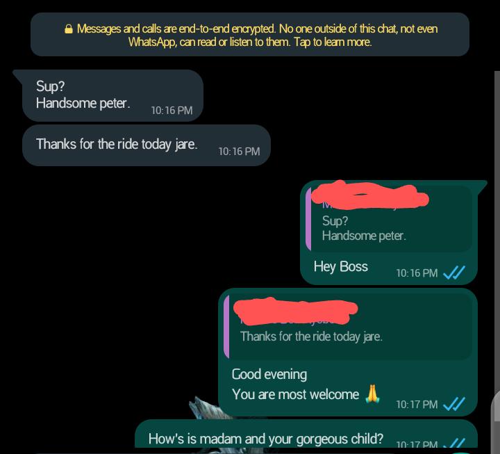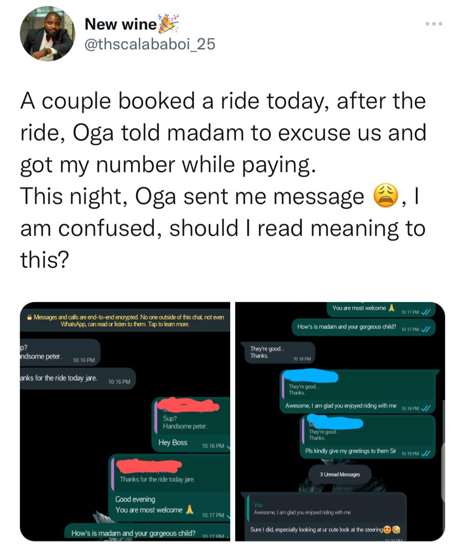 Later that night, the husband sent a couple of suggestive messages to the driver which has left him confused and seeking advise on what to do on Twitter.