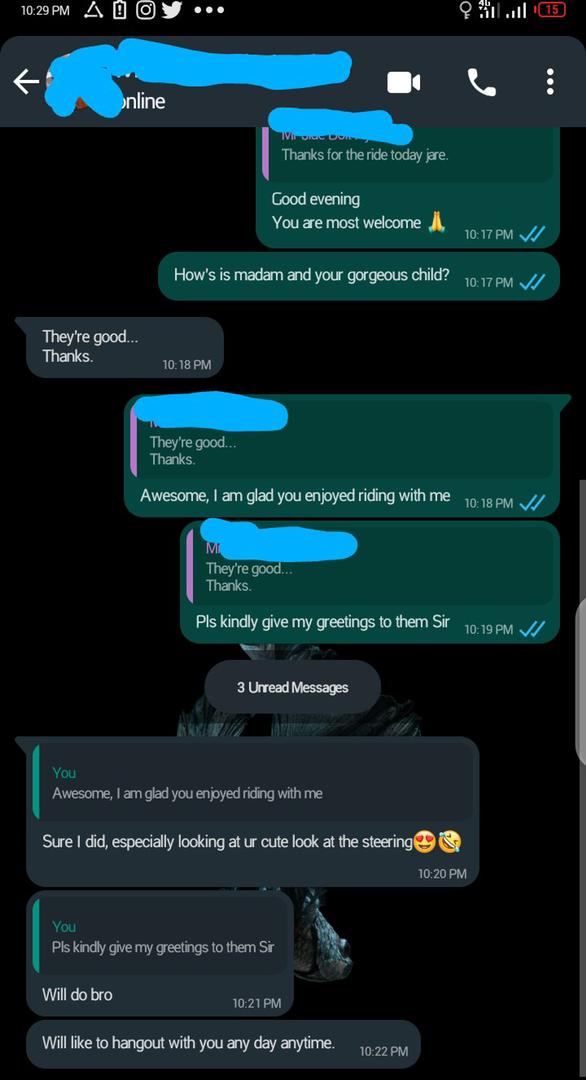 A couple booked a ride today, after the ride, Oga told madam to excuse us and got my number while paying.