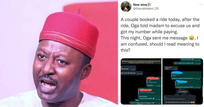 According to the user with handle, @thscalababoi_25, a couple booked his ride recently and after he ended their trip, the husband asked his wife to excuse them, using the opportunity to get the driver’s number.