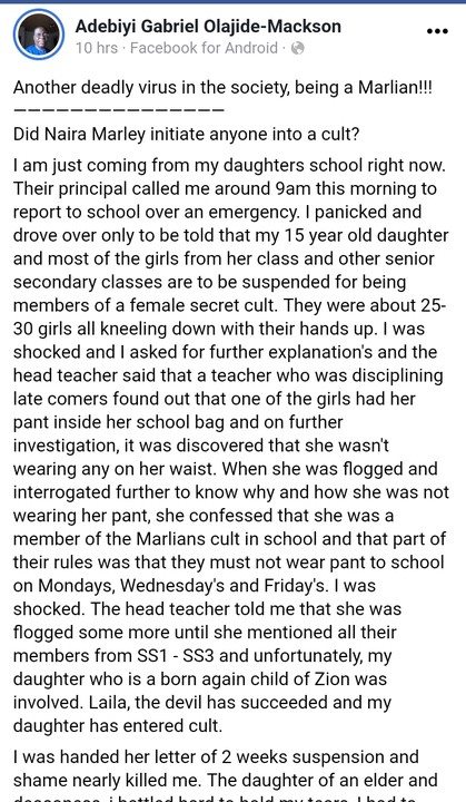 Taking to his facebook page, Adebiyi Olajide-Mackson, claimed that his daughter does not put on underwear again since she joined a Marlian gang in school.
