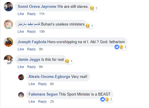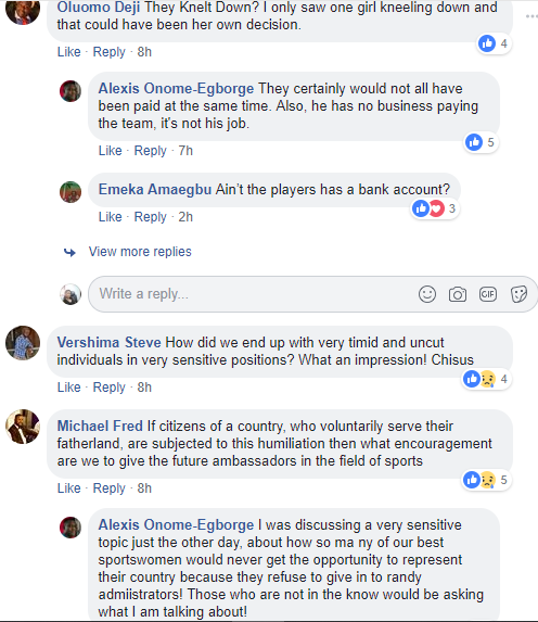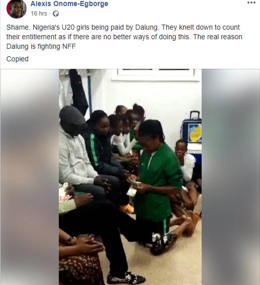 A video is currently trending online. In the video, some Nigerian U-20 women team can be seen kneeling down in front of the Sports Minister and other officials to collect their entitlements.