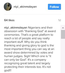 “Nigerians and their obsession with “thanking God” at award ceremonies. That’s a great platform to reach a lot of people and say really important stuff. Why do you think thanking and giving glory to god is the most important thing you can say at an award show determined by votes and human judges. Sigh! Which one is “it can only be God”. It’s a company recognizing great talent and largely protecting their interests too. It’s not god!!!”