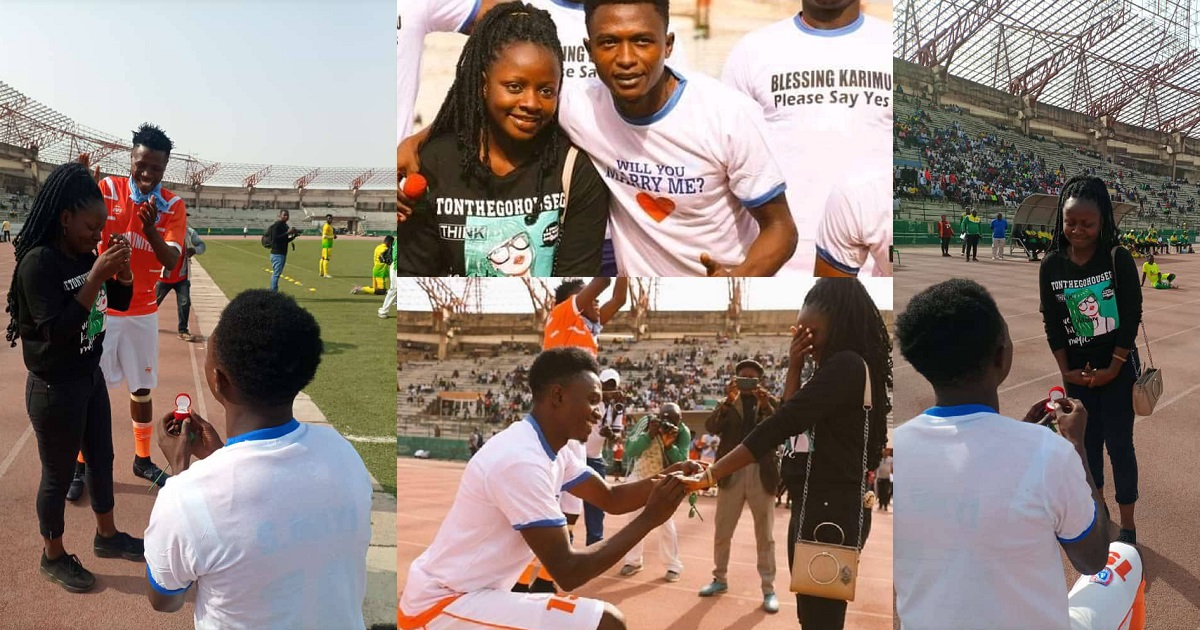 A Nigerian footballer, Mayi Amanzah Ademe Seth, has proposed to his girlfriend, Blessing Karimu, on the pitch at the New Jos Stadium in Plateau State.