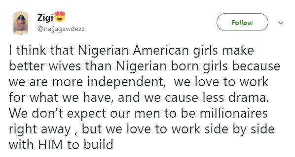 “I think that Nigerian American girls make better wives than Nigerian born girls because we are more independent, we love to work for what we have, and we cause less drama. We don’t expect our men to be millionaires right away , but we love to work side by side with HIM to build”