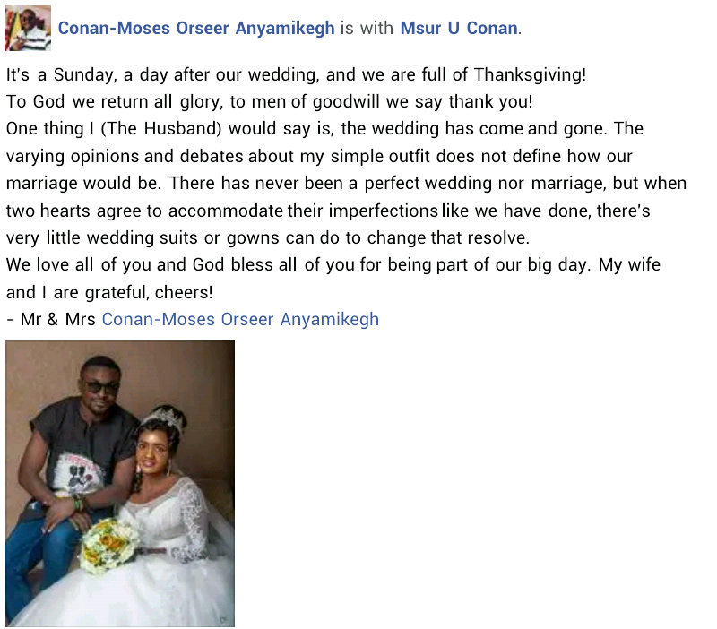 “One thing I (The Husband) would say is, the wedding has come and gone. The varying opinions and debates about my simple outfit does not define how our marriage would be