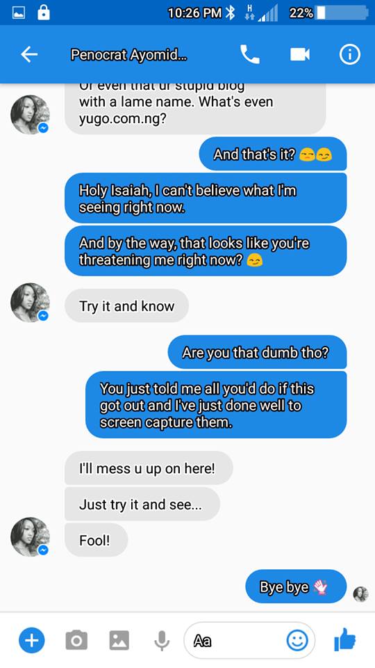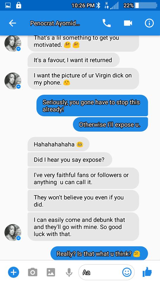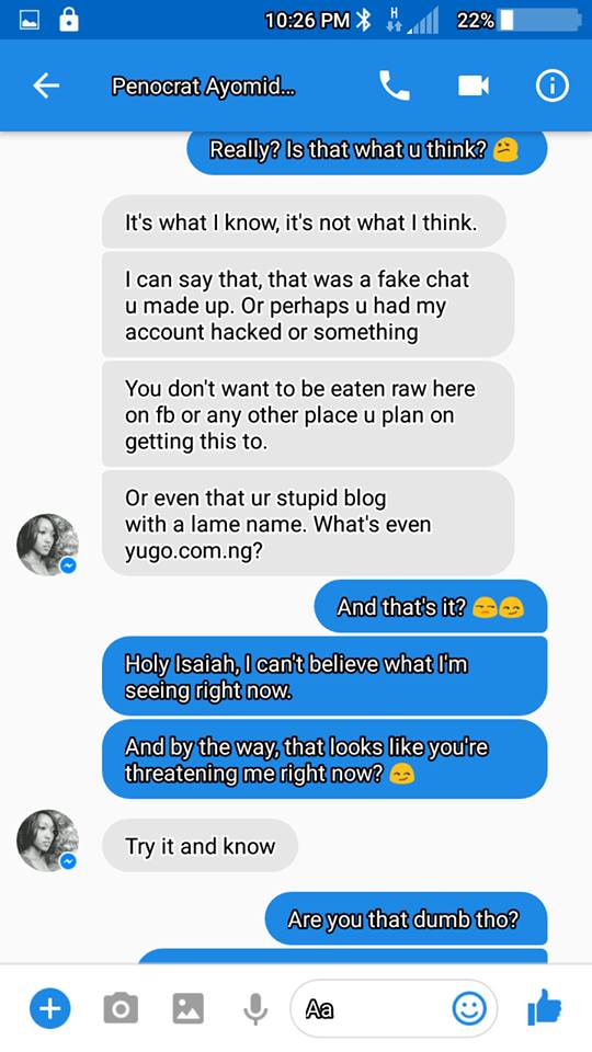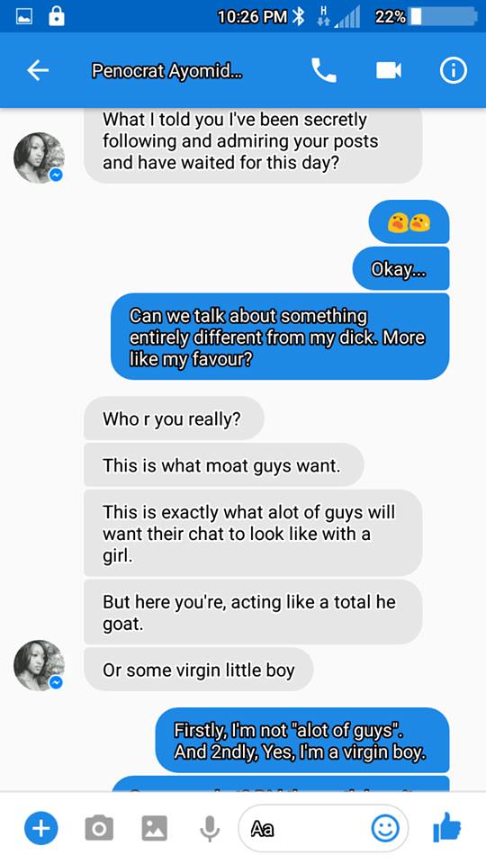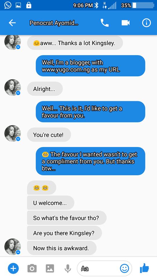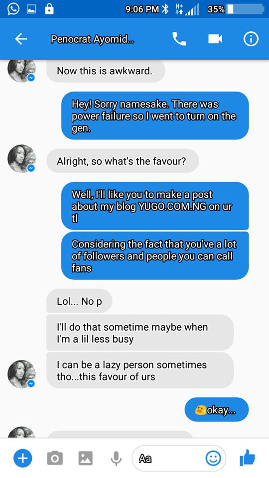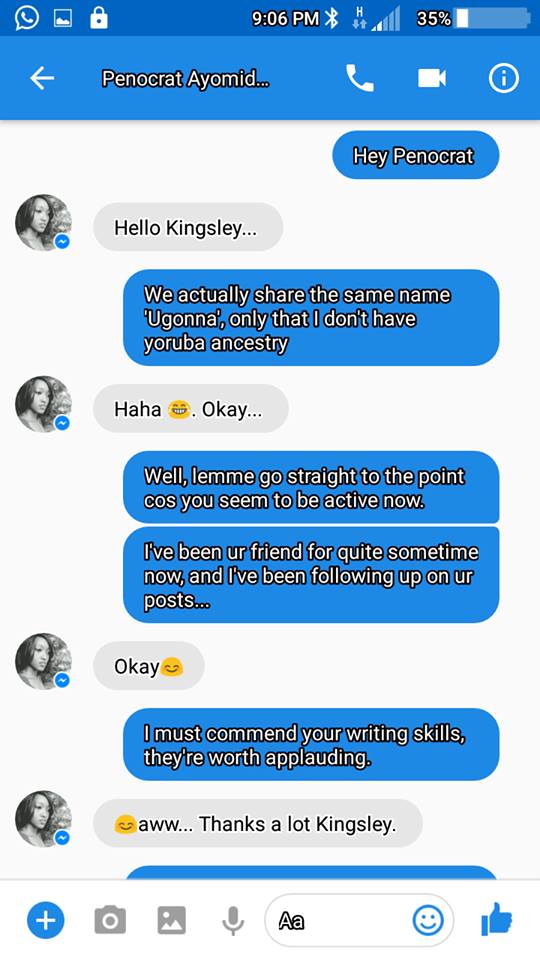 A few days ago, I had a chat with the “almighty” (at least that’s what she seems to claim), Penocrat Ayomide Ugonna concerning writing a post about my blog ***, here on facebook, considering the fact that she has loads of followers and people she may call fans here on Facebook.