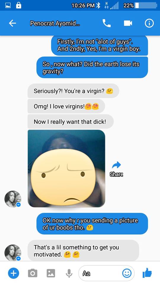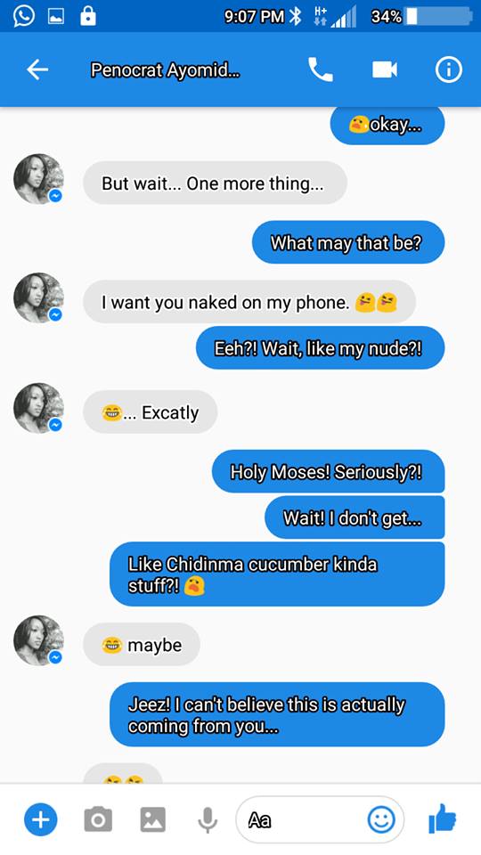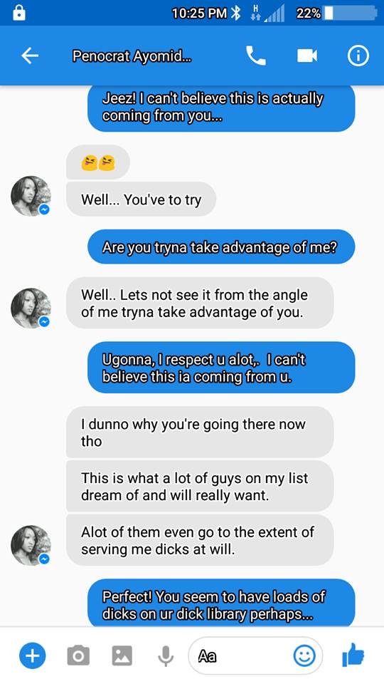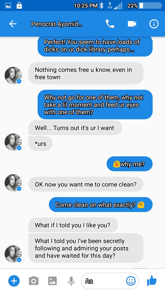 The lady identified as Penocrat Ayomide Ugonna in the chat says she wants to get down with Kingsley, but then he refused, as he only wanted a favor from the lady, which was: “Please post my Blog URL on your Wall”.