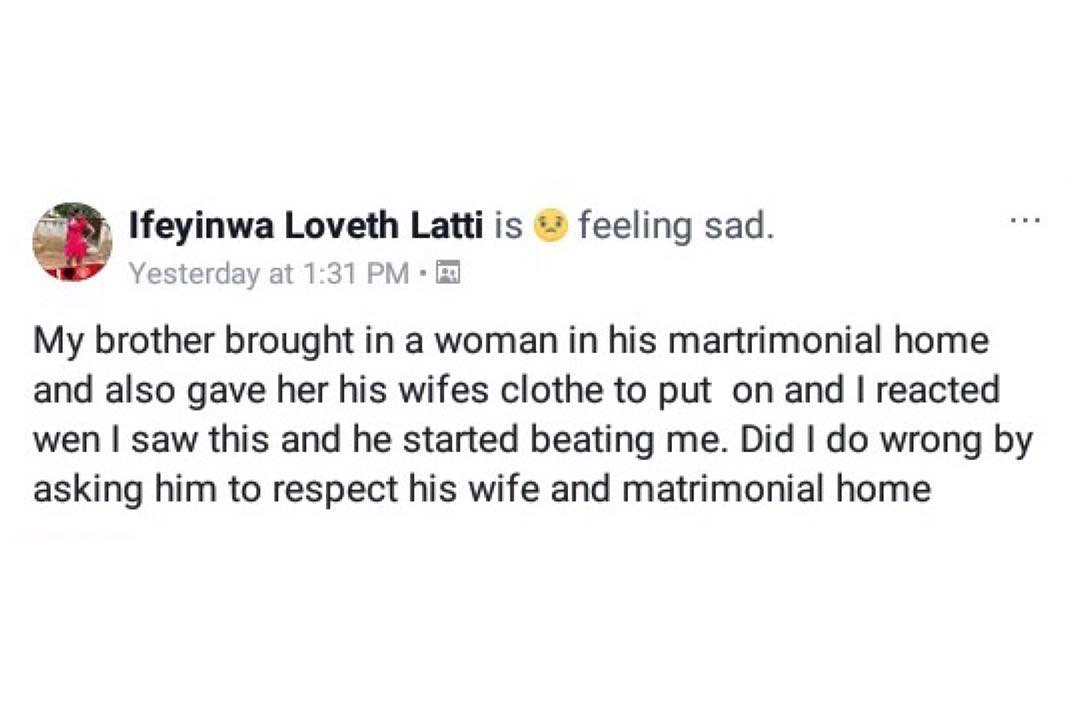 Ifeyinwa Loveth Latti on Facebook, took to the platform to share how her brother brought to his matrimonial home a lady who how then clothed with his wife’s clothes and all… She then confronted him about it but things didn’t end well cause she got assaulted by her brother.