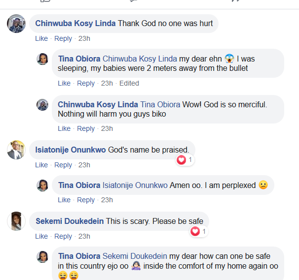 “What kind of useless country is this? You are staying at home, wahala, you are outside wahala. From no where this bullet just pierced our POP and hit the tiles with a loud bang… By Gods Grace no one was hurt.” she wrote.