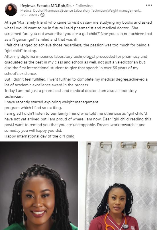 In a LinkedIn post, Ifeyinwa shared that she triumphed over the limitation of that family friend’s words as she became a medical doctor in 2020 with many awards.