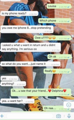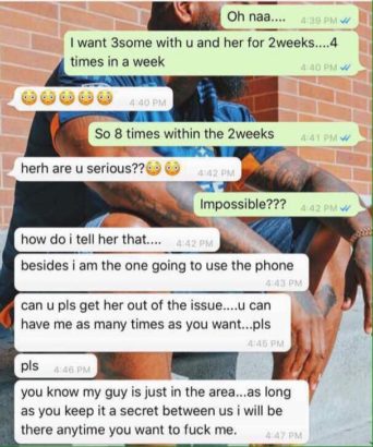 The guy says in the chats, that he wants a threesome with her and her friend, but because she’s the only one to get the benefit from the rendezvous, she opts out that the guy gets down on her as many times as he wants.