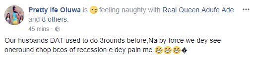Identified on Facebook as “Pretty Ife Oluwa” she simply wrote: “Our husbands DAT used to do 3rounds before,Na by force we dey see oneround chop bcos of recession.e dey pain me.”