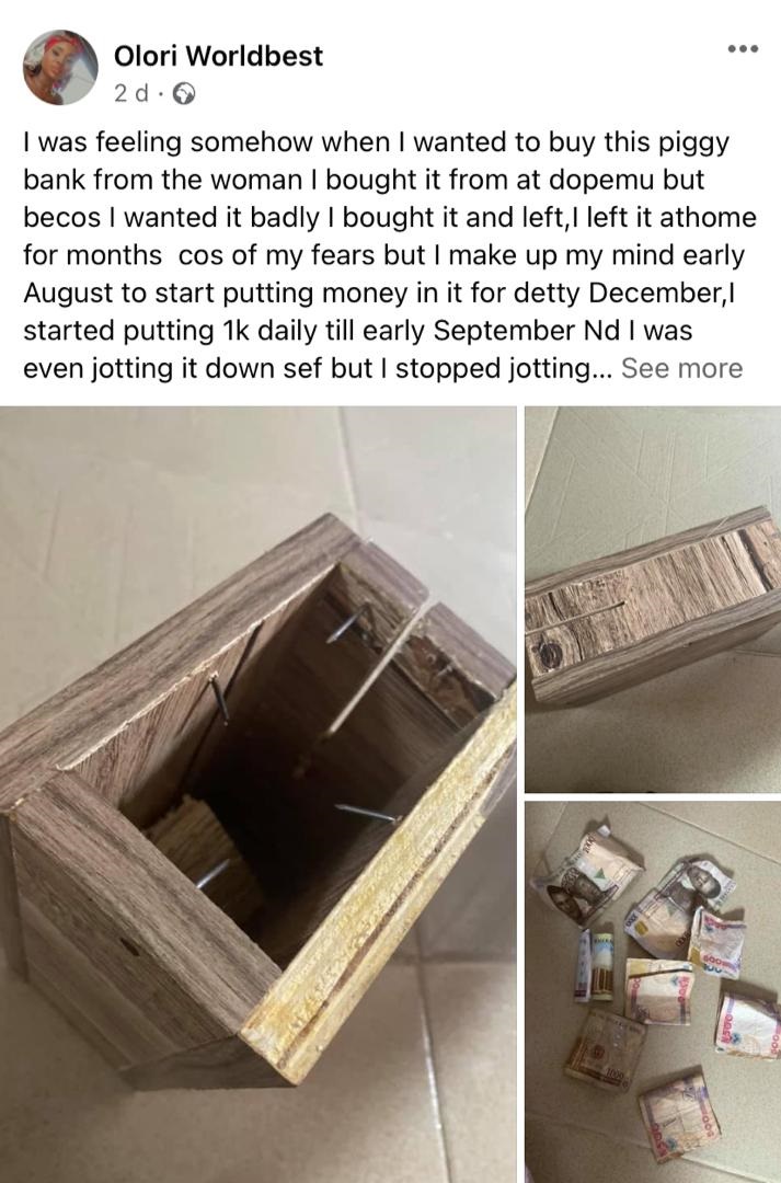 According to the lady identified as, Olori Worldbest on Facebook she bought the piggy bank in the Dopemu area of Lagos in August and was sure she has saved up to N30,000.